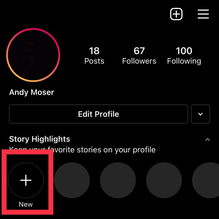 Buka profil Anda dan ketuk ikon “Sorotan” di bawah bio.